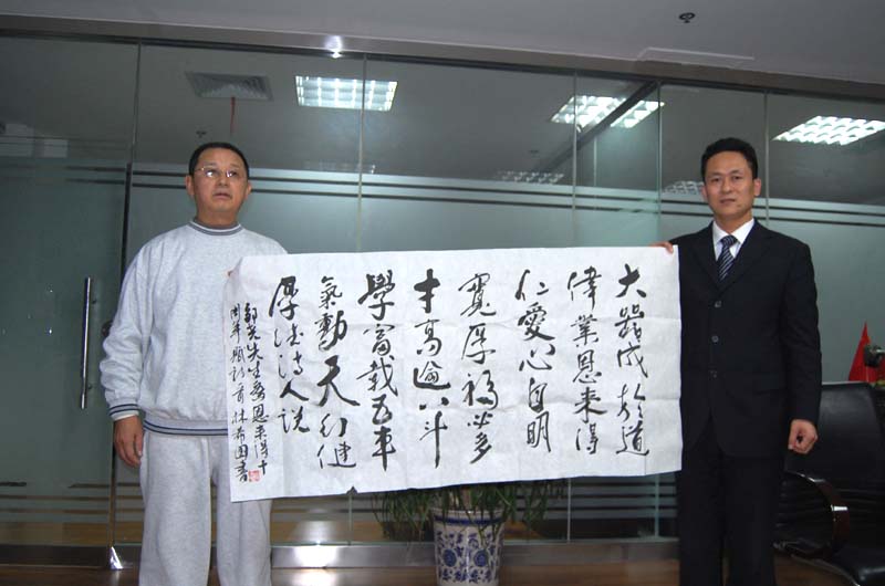 烟台市卫生局前局长邹瑶和烟台艺校党委前副书记林希国为庆典赠送合作的诗书作品