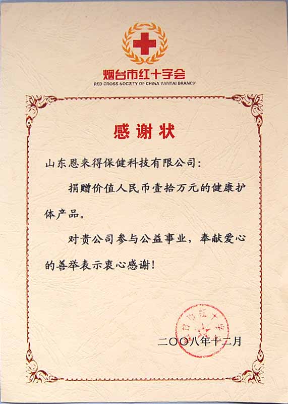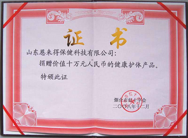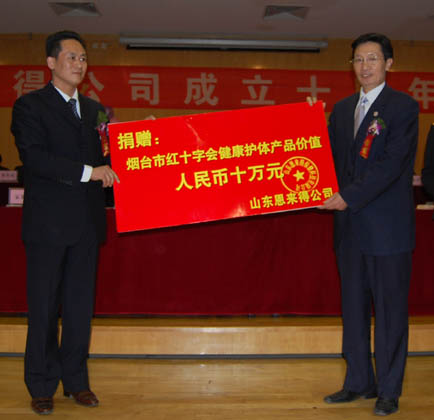在迎接十周年大庆之际。董事长提议、经董事会通过:节俭办庆典,奉献于社会。公司向中国红十字会烟台分会捐赠价值十万元的高级健康床垫,用于社会伤残人的康复。同时与红十字会联系,将爱心捐赠活动持续下去,恩来得关注社会弱势群体,通过不同方式进行帮助,开设爱心救济基金、产品销售按一定比例捐赠社会等等。在庆典召开的前两天,董事长在观看烟台电视台社会广角新闻中得知,烟台大学学生孙成法背着母亲上大学的消息,当即决定通过烟台红十字分会给予2000元人民币的帮助。