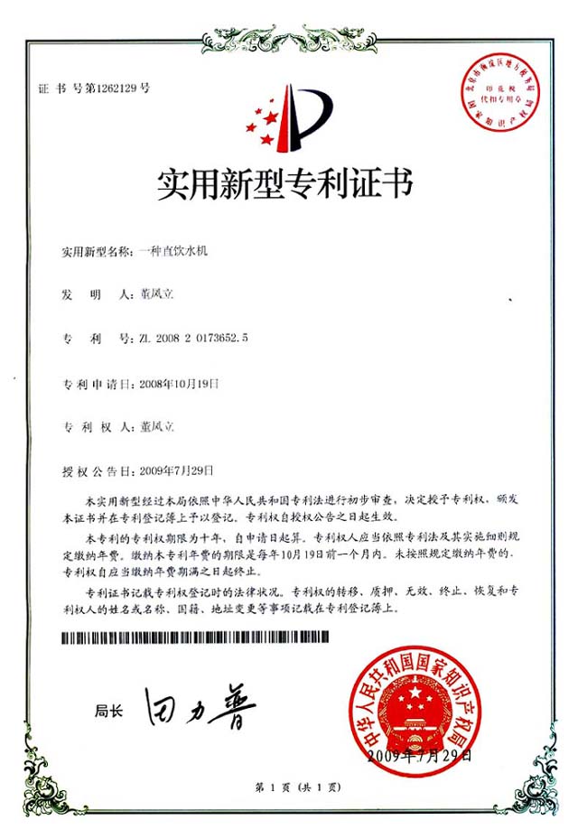 专利号:ZL 2008 2 0173652.5的恩来得能量纳米直饮水机是公司直饮水机生产以来的第三代产品,采用了最新的饮水过滤技术——UF中空纤维超滤膜和采用高科技成果——纳米托玛琳陶瓷球、电气石及天然矿石等,其技术达到国际产品同行业领先水平。