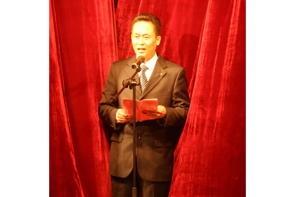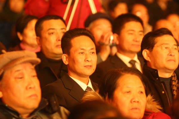 图为恩来得公司总经理董凤立先生(左二)与烟台市文化局徐明局长(右一)等各级领导一起观看演出