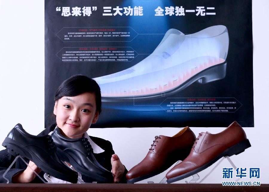 山东恩来得保健科技有限公司职员在展示高科技保健空调鞋(10月13日拍摄)。 由中国制鞋研究所、山东恩来得保健科技有限公司联合研制的高科技保健空调鞋经过两年的精心雕琢,日前在国内限量上市,价格过万。 该高科技保健空调鞋依据仿生学、工程力学、保健医学原理,利用空气循环和能量循环系统、使用纳米与磁疗技术,可实现脚部血液循环,将健足、护足合二为一,从而达到强身健体的目的。 新华社记者 陈建力 摄