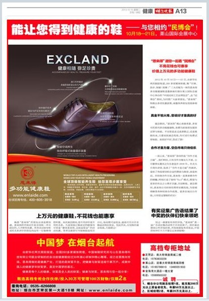 2013年10月18日——21日,由新华社两次跟踪报道,280多家媒体转载,集“空调、助步、保健(按摩)”三大功能为一体的恩来得多功能健康鞋受邀参展在烟台莱山国际会展中心举办的“中国民间工艺品博览会”。此“民博会”期间,为回馈广大新老朋友,“恩来得”特推出多项优惠政策,诚邀各界朋友现场参观体验。
