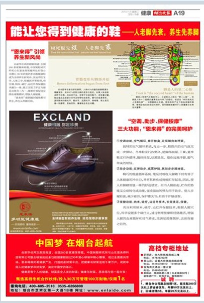 由新华社两次跟踪报道,全国280多家媒体转载,中国制鞋研究所和山东恩来得保健科技有限公司潜心30年研发的多功能健康鞋成为全球养生新风尚。其运用仿生学、人体工学、保健医学等原理,将空调、纳米、磁疗、远红外等保健技术融为一体,真正实现了护足与健足功效合二为一,能够有效促进足部血液微循环,增强人体健康。