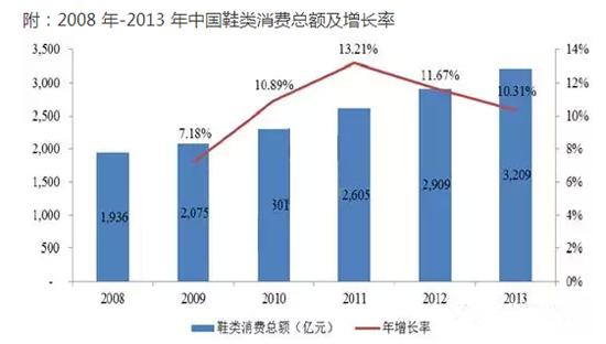 中国产业信息网发布的《2014-2019年中国皮鞋制造行业深度调研及投资前景研究报告》中显示:随着国民经济增长和消费者可支配收入的增加,消费者对皮鞋时尚度和舒适度要求也越来越高,消费者愿意购买的皮鞋价位也不断提高,为具备良好品牌形象和较高时尚度的皮鞋产品销售提供强劲动力,因而皮鞋消费市场前景广阔。2008年-2013年中国鞋类产品消费额稳步增长,年复合平均增长率为10.60%。预测,2015年-2018年中国鞋类产品消费额将保持 6.40%的复合平均增长率,预计到2018年将达到 4,383.90亿元。