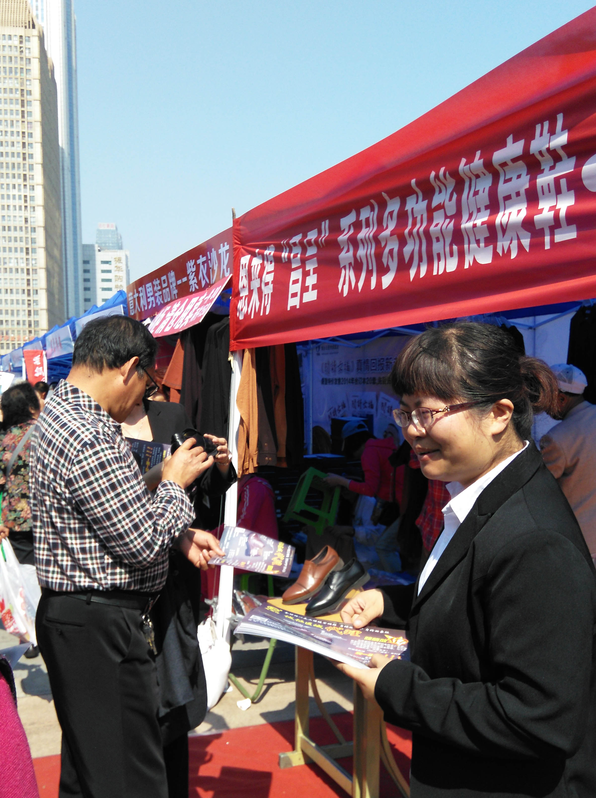 16日上午8点不到,中心文化广场人头攒动,恩来得展位前,咨询群众络绎不绝。有了解功能的;有仔细端详的;有试穿体验的;有恰谈代理的,工作人员满面春风,耐心细致的解答着每一个问题。