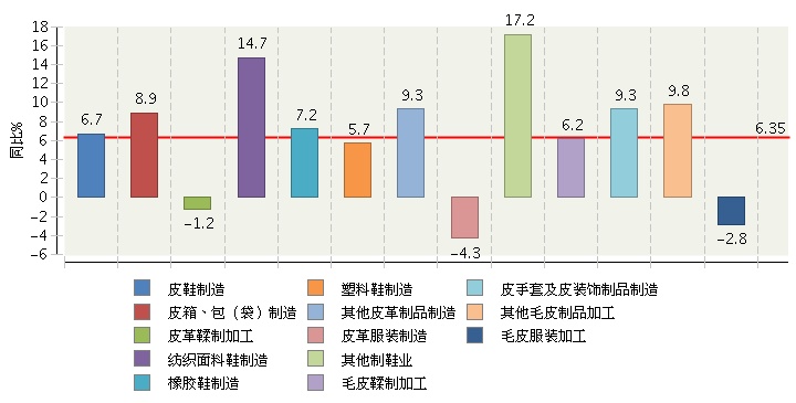 图3 2017年1~4月全国皮革行业累计主营业务收入行业小类同比增长情况