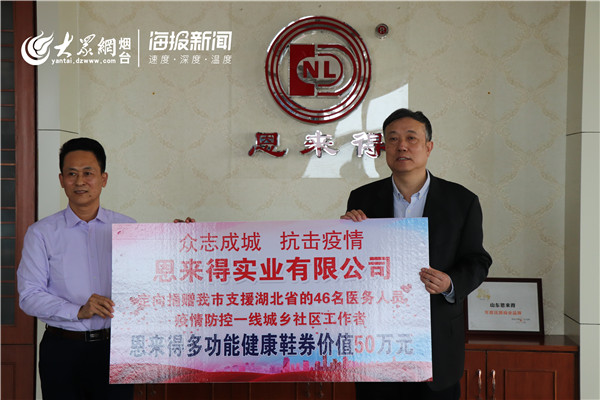 大众网·海报新闻烟台3月31日讯 (记者 邢晨 通讯员 陈吉战) 3月31日下午,“迎接赴湖北英雄凯旋,为一线抗疫工作者送健康”捐赠仪式在山东恩来得实业有限公司总部举行。山东恩来得实业有限公司董事长、总经理董凤立代表公司,向烟台市红十字会捐赠了价值50万元的多功能健康鞋消费券,定向捐赠给烟台市赴湖北抗疫的46名医护人员,以及部分奋战在抗疫一线社区工作人员。