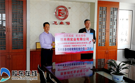胶东在线3月31日讯(通讯员 陈吉战)31日下午,“迎接赴湖北英雄凯旋,为一线抗疫工作者送健康”捐赠仪式,在山东恩来得实业有限公司总部举行。山东恩来得实业有限公司董事长、总经理董凤立先生代表公司,向烟台市红十字会捐赠了价值50万元的多功能健康鞋,定向捐赠给我市赴湖北抗疫的46名医护人员,以及部分奋战在抗疫一线社区工作人员。