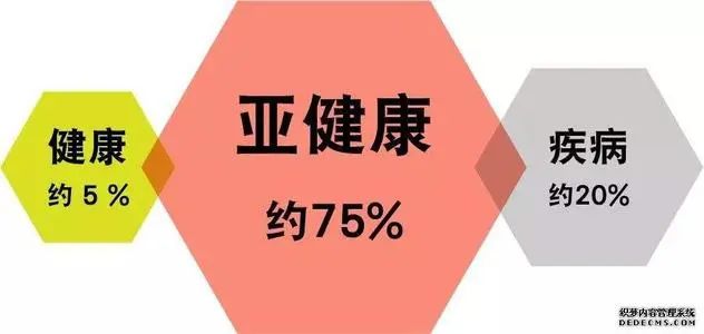1999年,世界卫生组织(WHO)宣告:亚健康与艾滋病是21世纪人类最大的敌人。据调查,中国符合世界卫生组织关于健康定义的人群只占总人口数的15%,有15%的人处在疾病状态中,剩下70%的人处在“亚健康”状态,而且,亚健康的检出率在不同性别、年龄、职业上有一定差异。